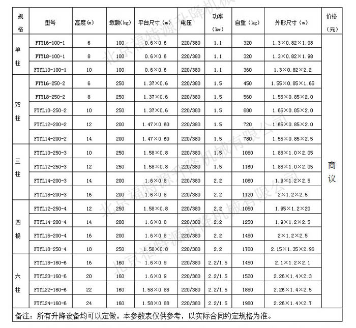 ▍鋁合金升降機常規(guī)參數(shù) / Product Parameter